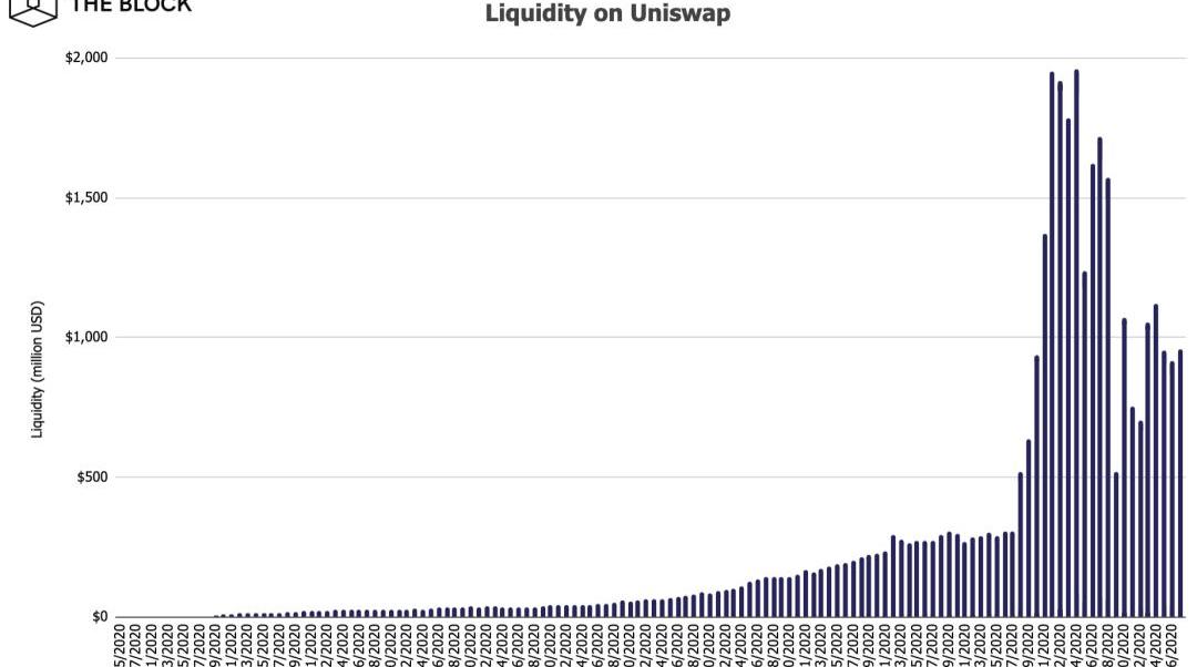 Uniswap的成功主要是基于流动性提供的便利性。自年初以来,其流动性稳步上升,近期由于SushiSwap等竞争分叉的流动性挖矿事件,其流动性出现了大幅飙升。
