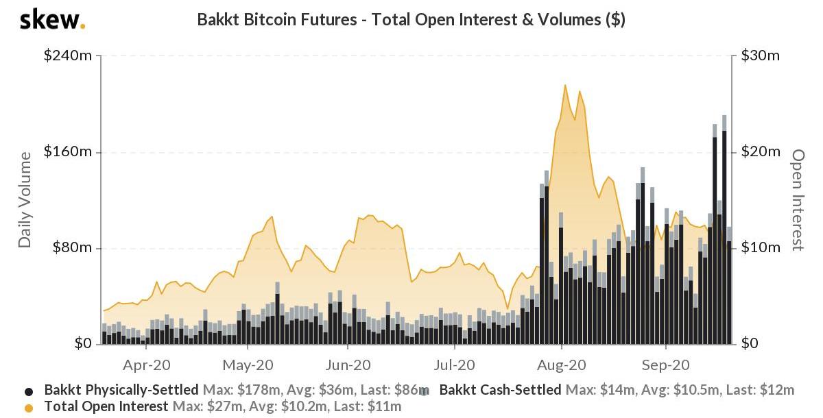 根据ArcaneResearch和Skew的数据,9月15日,Bakkt的每日交易量创下了历史新高,其中大部分是通过实物结算的。而就在24小时前,MicroStrategy又买入了价值1.75亿美元的BTC。