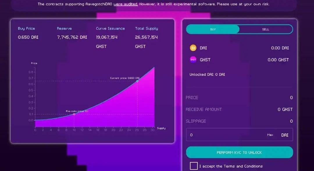 除了平台机制设计本身,GHST代币的发行过程中也引入了一些特别的因素:联合曲线(BondCurve)发行和DAICO的机制。
