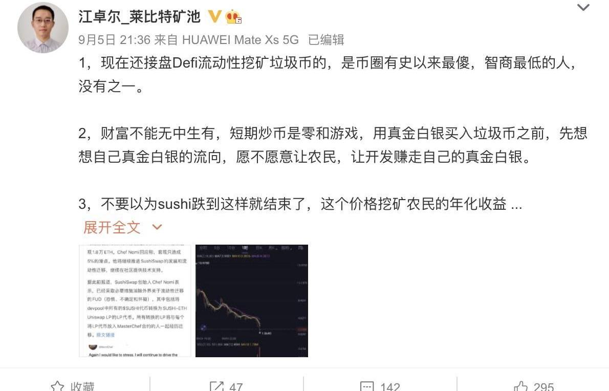 “现在还接盘Defi流动性挖矿垃圾币的,是币圈有史以来最傻,智商最低的人,没有之一。财富不能无中生有,短期炒币是零和游戏,用真金白银买入垃圾币之前,先想想自己真金白银的流向,愿不愿意让农民,让开发赚走自己的真金白银。