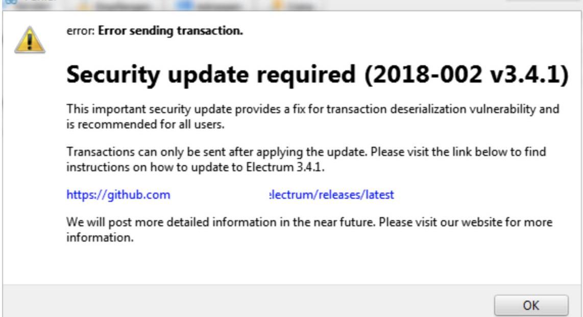 值得一提的是,任何人都可以去搭建一个Electrum节点服务器。如果一个用户连接到了攻击者的服务器并发起了一笔交易,服务器可以返回任何设计好的错误信息。比如返回一个让用户去更新Electrum钱包的错误信息,如下图所示。