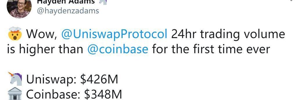 DEX类也开始逐步碾压二线甚至挑战一线交易平台,就在8月30日,Uniswap也再次达到一个新的里程碑——24小时交易量有史以来首次高于Coinbase,Uniswap24小时交易量超过4.26亿美元,同期CoinbasePro24小时交易量则为3.48亿美元。