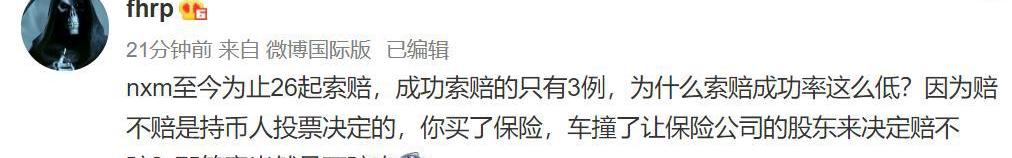 仍是以NXM为例,至今为止26起相关的索赔,成功索赔的只有3例。“fhrp”就对此一针见血,“赔不赔是持币人投票决定的,你买了保险,车撞了让保险公司的股东来决定赔不赔?那答案当然是不赔咯”。