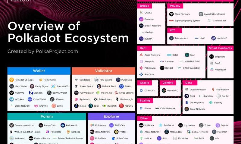 除了波卡主网之外,目前较为知名的包括Kusama、Edgeware、Acala、Darwinia、Stafi、Phala、Bifrost、Plasm、Kulupu、Centrifuge、Westend和ChainX等项目也都属于波卡生态。