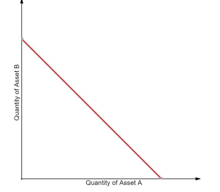 x+y=k,绘制出来是一条直线。不幸的是,当这两种代币的链下参考价格不是1:1时,这种设计会使得套利者有机会耗尽其中一个资金池。该情况会破坏其中一个流动资金池,迫使流动性提供者承担损失,而交易方则不再有可用的流动性。因此,CSMM这种AMM模式并不常见。