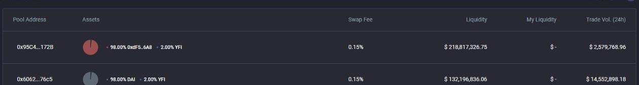 在Balancer池子中存入98%的yCurve+2%的YFI来耕种额外的YFI;