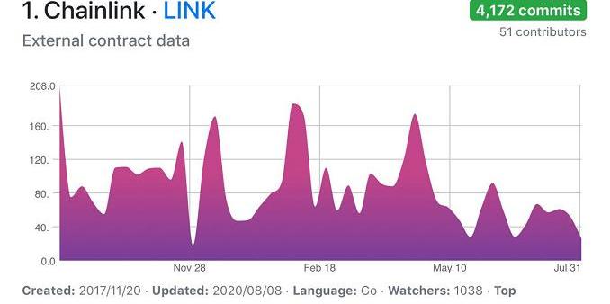 LINK的代码库一直保持频繁更新。据CryptoMiso网站数据显示,过去12个月中,GitHub代码更新最频繁的区块链项目就是LINK,51位开发者提交了4172行代码。