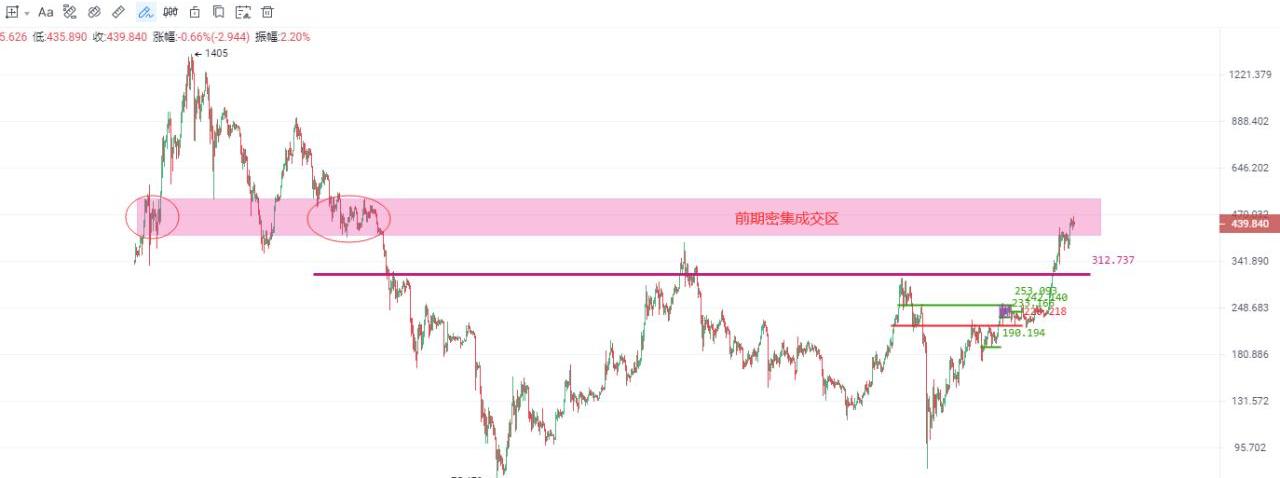 主观预期:延续昨日预期,预估短期或在冲高至450-460区域后受阻回落。本段不作为交易策略参考。
