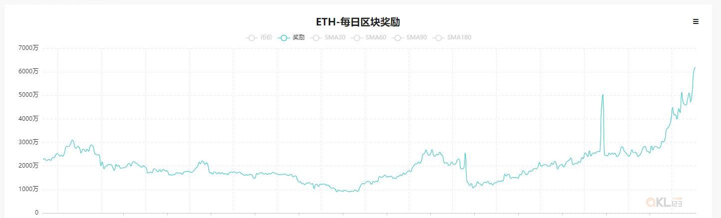 如果看过去一年以太坊的每日区块奖励,2019年8月约为1696万,今天,这个数据是6204万。增长了265.8%!
