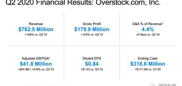 7月30日,Overstock公布了其2020年第二季度财报。报告显示,在整个Q2季度,Overstock的总收入为7.83亿美元,较去年同期的3.74亿美元激增109%。总利润为1.80亿美元,同比增长143%。调整后的税息折旧及摊销前利润为4180万美元,相较去年同期同比增加了5490万美元,增长了400%以上。其管理费用占收入的比重为4.4%,同比下降413个基点,这意味着Overstock在收入表现强劲的同时,营运成本亦是控制得当。Overstock第二季度每股净收益为0.84美元,相比之下,去年同期每股净亏损为0.69美元,扭亏为盈,增长了1.53美元。