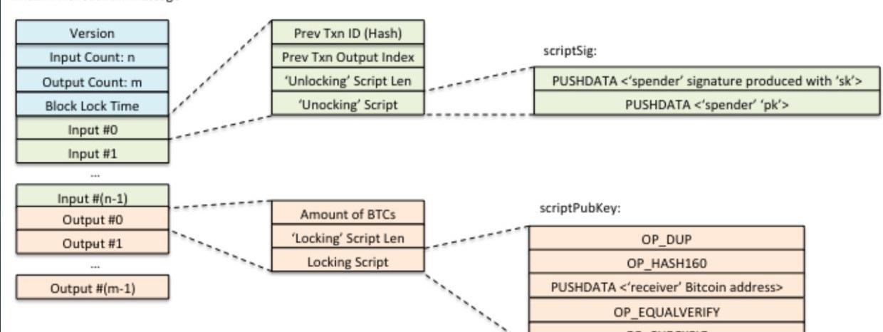 输出中包括了收款方的信息,比如上面的数量和锁定脚本。锁定脚本指定了接收者的比特币地址,以及什么情况下,这个比特币可以被花费。