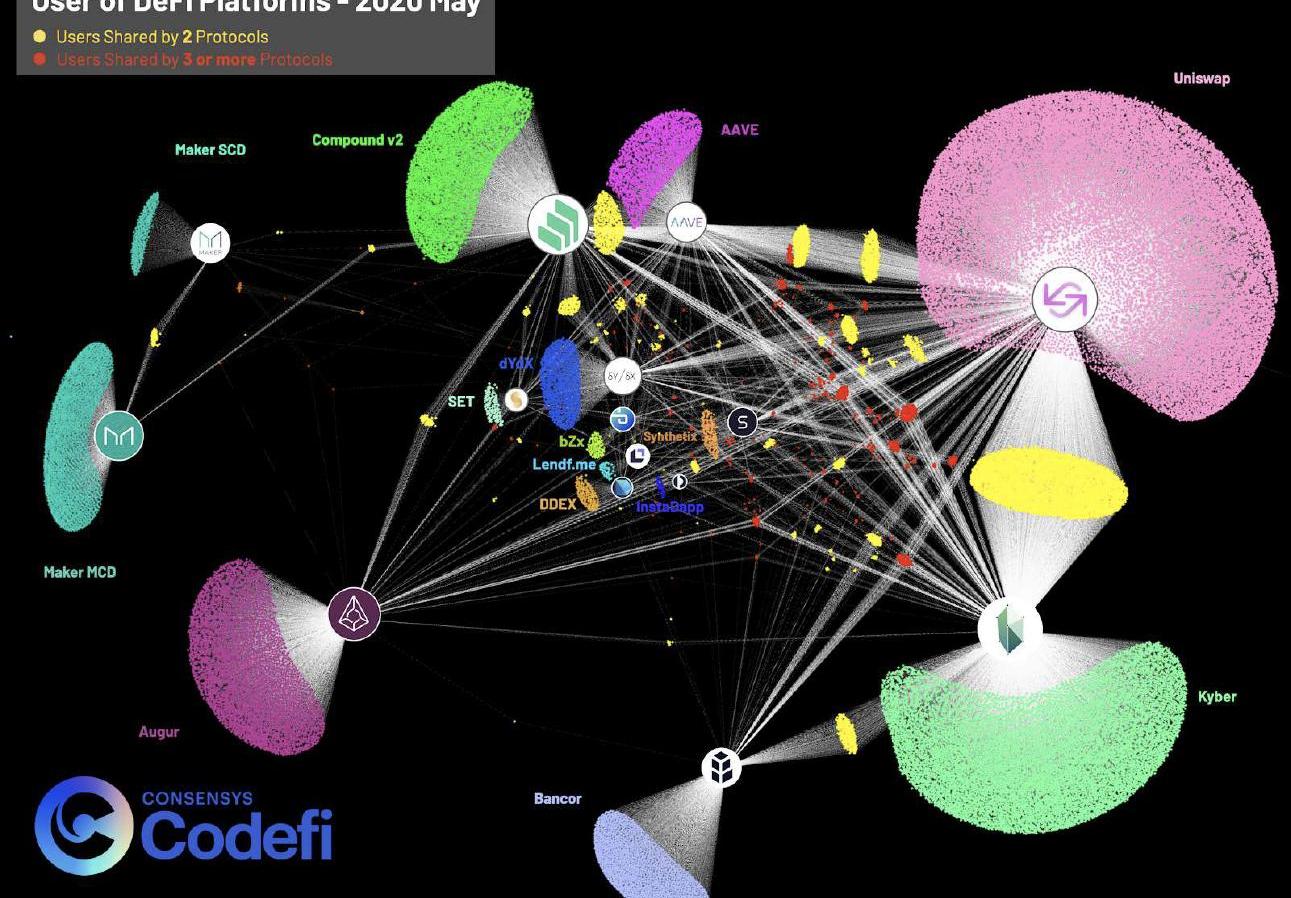 本报告中的DeFi网络图向您显示了2018年至2020年之间基于区块链的新兴金融软件行业之间的用户增长,演进和互连性。数字货币在左侧抵押,在中间跨各种贷款产品进行投资,然后在右侧发送至多个交易和衍生交易所。服务提供商,其专业化和用户的数量正在增长。这些服务之间的联系以及它们之间的经济活动也在增长。这既是优点也是缺点。系统性风险来自过多的相互依赖性。但是网络效应和社区也是如此。