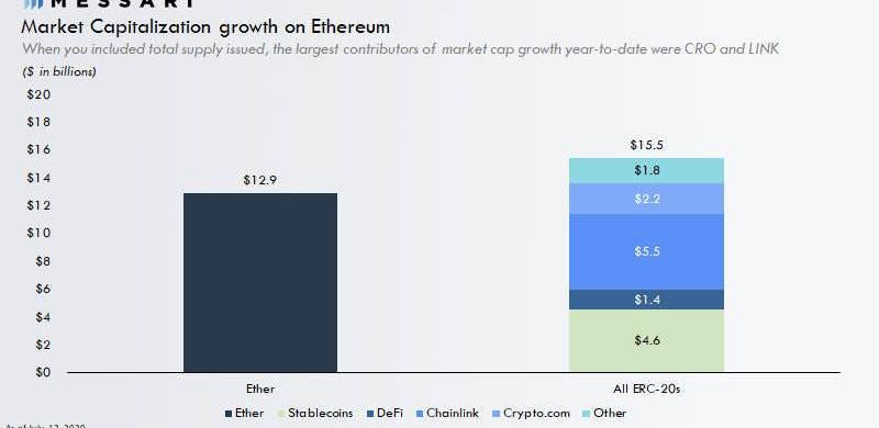 但事实是,DeFi代币价值增长远超ETH,所有现存的ERC20代币的总市场价值已经超过以太坊的市值。