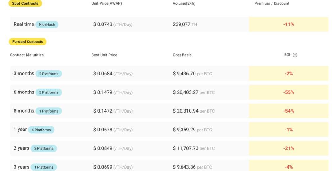 除了财务评估的复杂性,购买和运行矿机还面临许多运营方面的挑战。对于零售买家而言,这一过程可能过于艰辛、难以掌控。一种参与挖矿的更简单方法是购买云挖矿合同。云挖矿是算力衍生产品的一种原始形态,它将矿机的未来生产与其当前物理位置分离。在本节中,我们将介绍合成算力的几种不同变体。