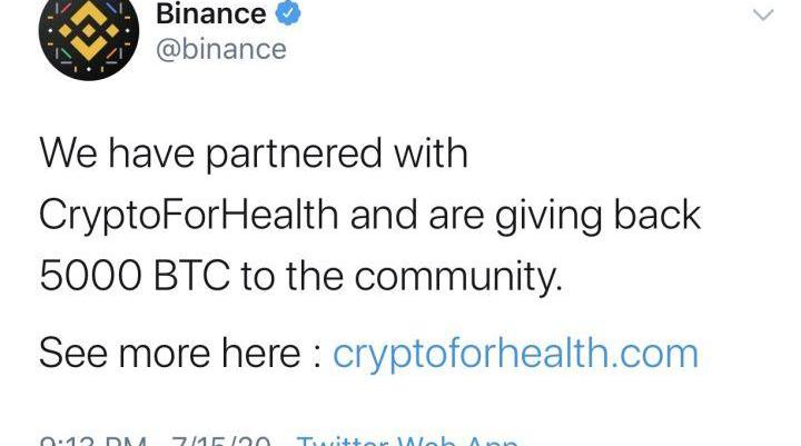 第二条信息于一小时以后属于Binance的账户发推称,该公司与”CryptoForHealth”社区合作,将5000BTC返还给社区成员。