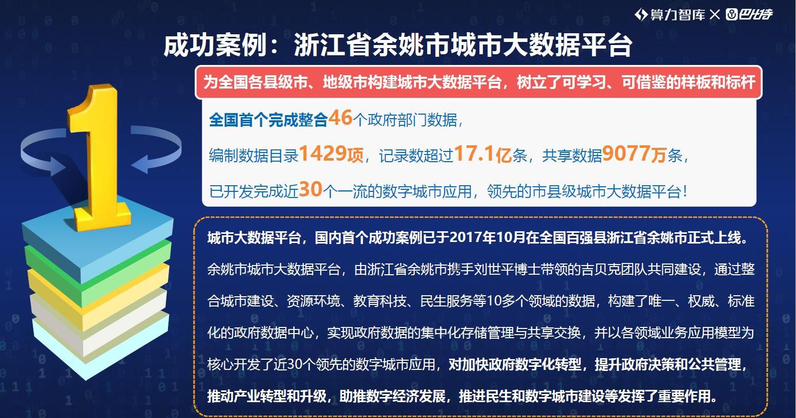 围绕这些东西,但是能够干什么这个很重要,关键数据打通要解决什么问题,我们已经完成了30项的应用,目前据我所知是在任何一个智慧城市中应用也是最完整的,因为它是一个县级市,我们最早的时候和石家庄市做,石家庄市大市长支持,干不了,各个局去找的时候他们说数据不会给你的,所以我们把石家庄的大数据平台项目变成石家庄市统计大数据,因为负责具体项目的人是统计局局长,最后我们在盐城干,江苏盐城,也有同样的问题,数据整合非常困难。最后我想了一句话,想了半天我想明白一个道理,中国人有一句话叫做麻雀虽小五脏俱全,中国政府机构中什么是最小的麻雀?县级市,一个城市区也是没用的,但是县级市是可以的,我们找到了余姚,这些数据打通以后很棒。