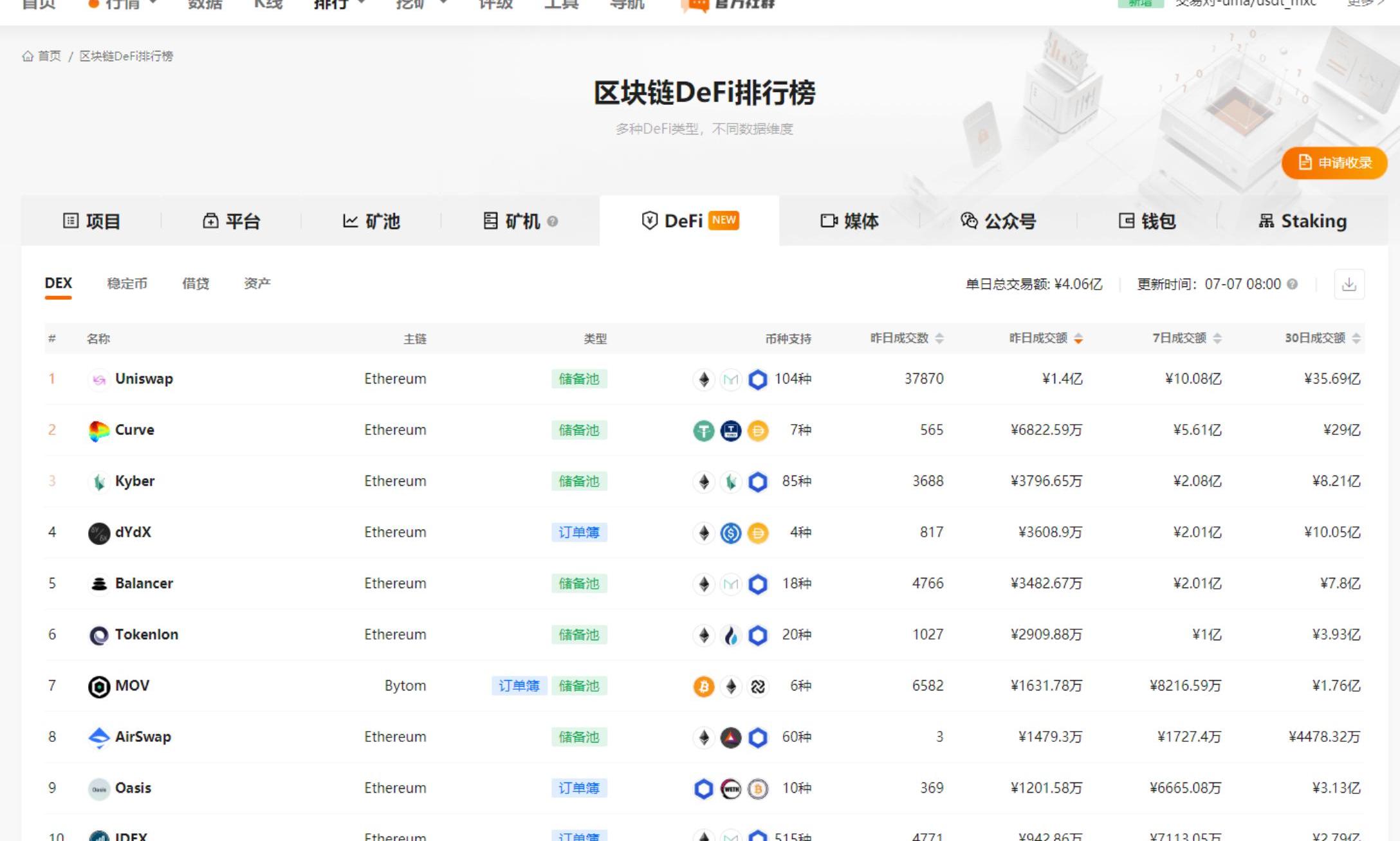 比如,针对DEX,我们会去看它的几个数据,包括主链是什么,属于什么类型,交易币种是什么,成交量和成交额如何,我们尽可能做到每天实时更新。