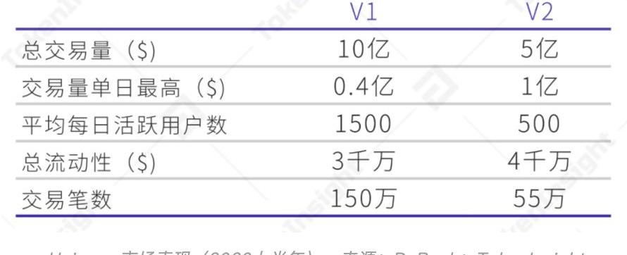 Bancor是第一个AMM,属于恒定乘积做市商。但在2020上半年整体表现较弱。而同为恒定乘积做市商的Uniswap表现则更加优越,已成为DEX中的领导者。该项目团队于本年5月份推出的UniswapV2一经推出便博得眼球,在6月份中其交易量为DEX行业第一。两者2020上半年市场表现对比如左表,V1在上半年整体表现为高开低走,V2在6月份的表现强劲。