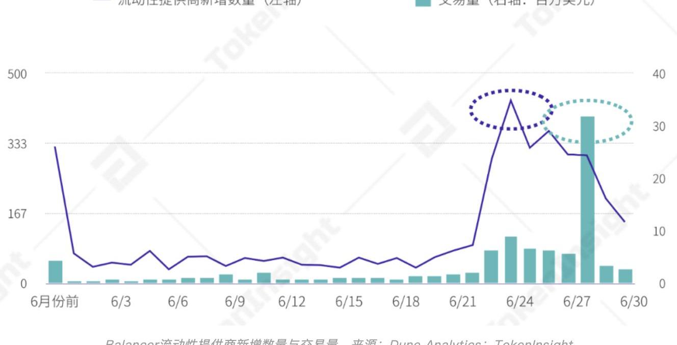 下图为Balancer上线以来流动性提供商情况图,在6月23日、24日两日流动性提供商新增数量出现明显增加。TokenInsightResearch认为这是由于6月24日Balancer宣布治理通证BAL上线,且在当日发放43.5万枚BAL给流动性供应商引起。而交易量在6月底出现跳跃式涨幅,则是因为Balancer两个资产池遭受到闪电贷攻击,并被抽走50万美元。