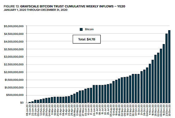 Grayscale在第四季度共流入了33亿美元,使2020全年的流入资金达到57亿美元。
