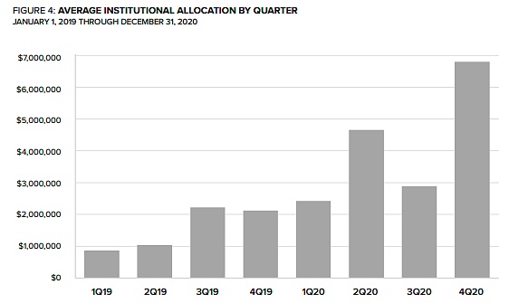 机构间的平均承诺额也在以显著的速度增长。(2020Q4)机构的平均承诺额为680万美元,高于第三季度290万美元的平均水平。