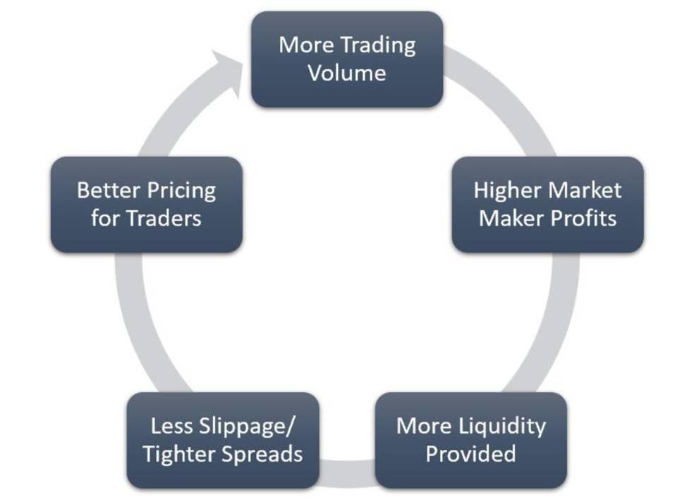 反馈回路:更多交易量?做市商获得更多利润?提供更多流动性?点差收窄?为交易者提供更好的定价?交易量会变得更多