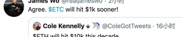 6月6日,ETCLabs创始人JamesWo就在推特上表示,以太坊未来10年将达到1万美元,但ETC会更快达到1000美元。
