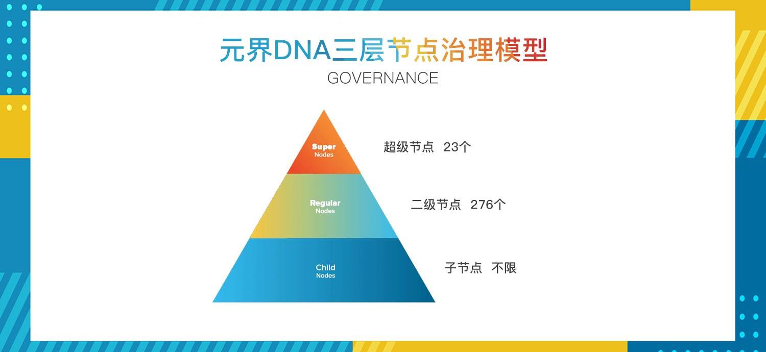 共识是公链最重要的财富,元界公链要构建去中心化新现实,首先需要搭建一套合理的治理机制。元界DNA独创性设计了三层节点治理模型,通过子节点共同投票的方式,推举有治理能力的23个超级节点和276个二级节点,超级节点和二级节点共同担当起元界DNA的链上治理,参与元界重大升级的决策,维护元界DNA的链上安全等。