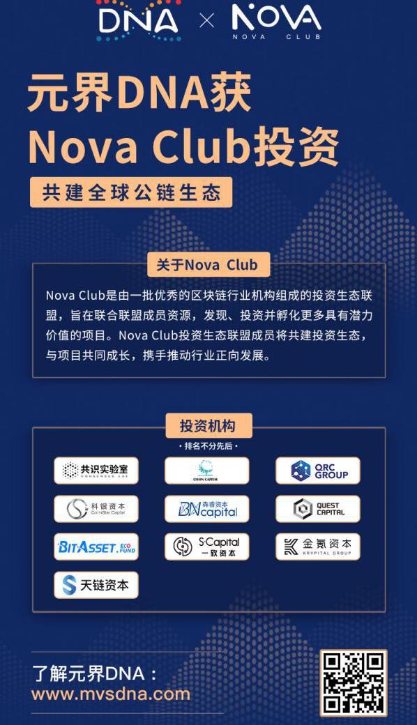 2020年二月下旬,全球知名区块链投资机构生态联盟NovaClub携十机构参投元界DNA项目,领投的投资机构成员包括共识实验室、ChainCapital、QRCGroup、犇睿资本、科银资本、QuestCapital、BitAssetEcofund、一致资本、金氪资本、天链资本等,均是NovaClub核心的投资机构成员。