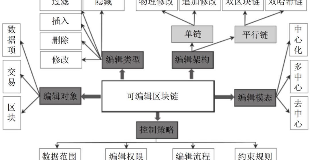 编辑架构:即单链架构和平行链架构,前者有物理修改和追加修改两类;后者则包括双区块链和双哈希链两类