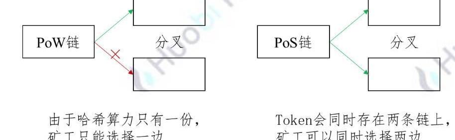 「无利害攻击」是PoS系统的一个经典攻击问题。PoS系统节点持有权益证明就可以参与挖矿,权益占比越大负责出块的概率也越大,由于PoS不需要额外付出挖矿的算力成本,挖矿边际成本为0,区块链网络产生分叉的可能性更高。PoS验证者可以选择同时在两条链上进行「投票」,不论最后哪条链成为「最长链」胜出,验证节点都可以获得区块奖励。这和PoW链不同,如图4所示,PoW链不会发生这种现象,因为算力只有一份,而Token同时存在在两条链上。随着时间推移,这种无成本为多条链出块的投票行为会助长更多的网络安全攻击行为,损伤区块链网络本身的安全性。