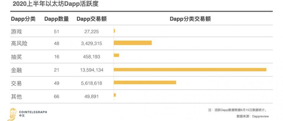 在2020年6月15日以太坊活跃Dapp分类中,数量最多的是游戏领域,Dapp达到了51个,占比为20.32%。尽管游戏类Dapp数量多,但交易额却是最低,仅有27,225美元。