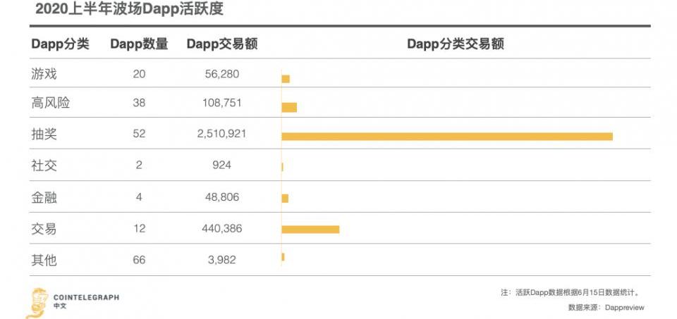 在2020年6月15日波场活跃Dapp分类中,数量最多的是抽奖领域,达到了52个,占比为35.62%。与以太坊不同,波场数量最多的领域是交易额最高的领域。抽奖类Dapp交易额在6月15日达到了2,510,921,是波场最活跃的生态分类。分类数量最少的是社交领域,Dapp数量仅为4个,占比2.74%。