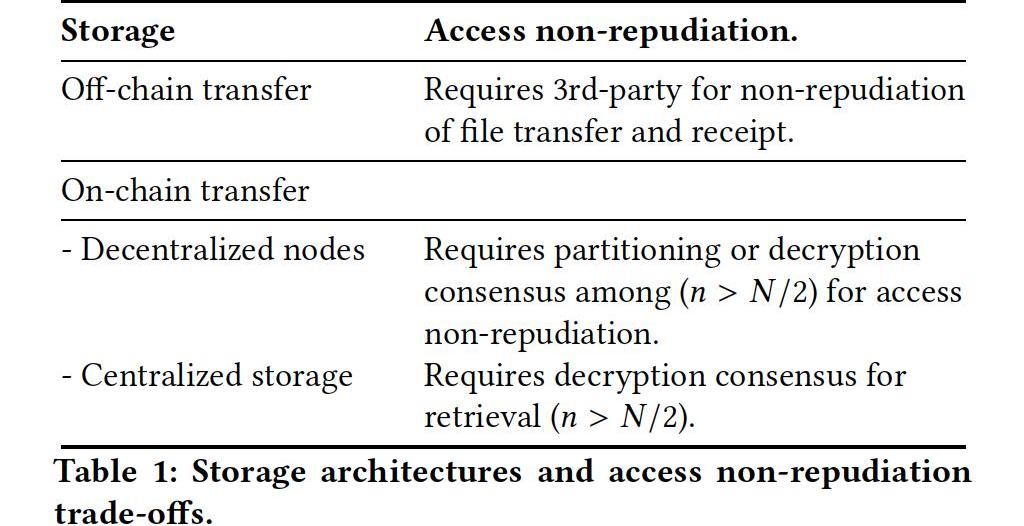 第一个数据交换架构使用区块链来简单地协调和记录各方之间的链下文件传输。第二种和第三种方法分别使用对等存储节点或集中式云存储平台通过区块链平台处理文件传输。每种方法在不可抵赖性和可审计性数据访问的可信任日志记录方面,以及在性能、存储和网络通信开销方面的权衡方面都面临着一定的挑战。