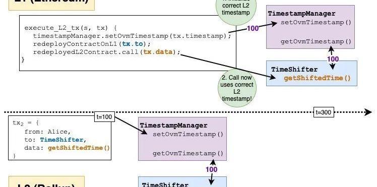 OVM提供了“容器纯度检查”的服务——检查目标智能合约“是否只通过执行管理器来调用虚拟化指令”,而不允许像是?block.timestamp?这样的操作!不论有没有其他智能合约调用了目标合约,只要合约未通过检查,就无法部署到OVM。这样就能保证L2的安全性。