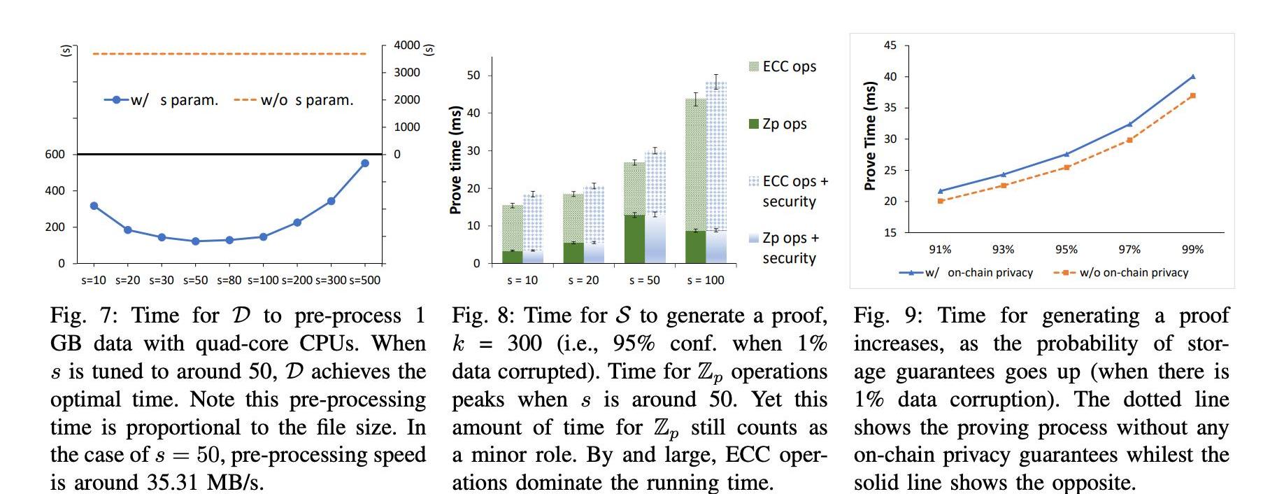 高效的存储提供商。存储提供商还可以从我们的审核解决方案中获益。通过引入参数s,从存储提供程序获得的额外存储的大小仅为原始数据大小的1/s。虽然通过增加参数s,生成证明的时间也增加了,但考虑到Zp和椭圆曲线上的所有密码操作,实际结果是相当令人满意的。图8显示了当被质询块的数量设置为300时,详细操作的处理时间。我们强调,在存储提供程序方面限制计算开销是很重要的。我们还提供了一个更彻底的比较,当挑战块的数量变化时,适合不同的存储保证级别。在图9中,我们发现,当给定1%的数据篡改时,随着存储保证的置信水平从91%上升到99%,生成证明的时间显著增加。