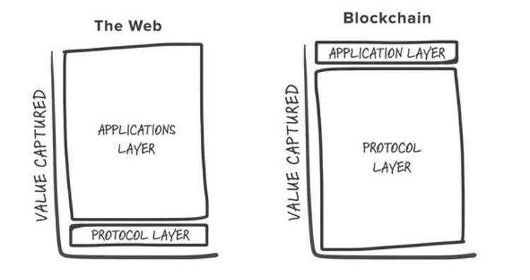 而区块链时代价值将集中在共享协议层,只有小部分价值分布在应用层。由此诞生了「胖」协议和「瘦」应用。