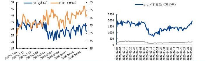 上周BTC日均算力达到117EH/s,环比上升4.8%;ETH全网日均算力达到180.2TH/s,环比上升1.8%。上周BTC全网挖矿难度为15.96T,环比上升1.4%;下次难度调整日在5月6日,预计难度值为16.07T(+0.67%);上周ETH全网平均挖矿难度为2.26T,环比上升1.6%。