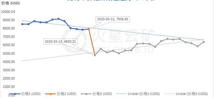 3月12日,比特币大幅跳水,自8000USDT跌破5000USDT,跌幅40%;3月13日比特币短暂反弹后再度下跌,至最低3800USDT,USDT大幅溢价。