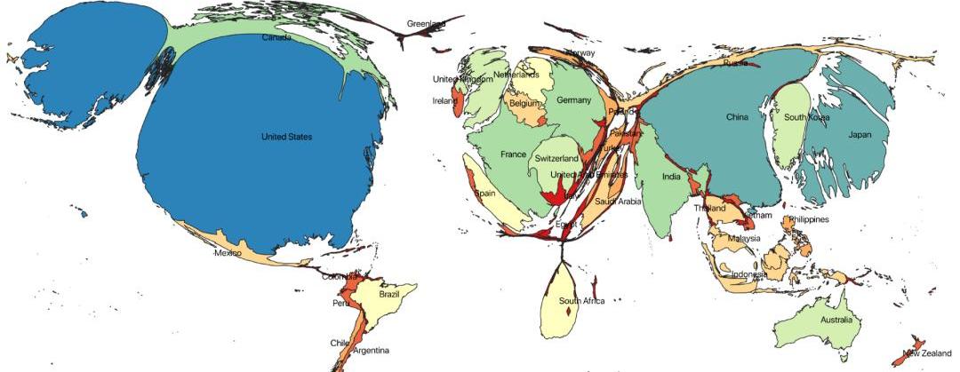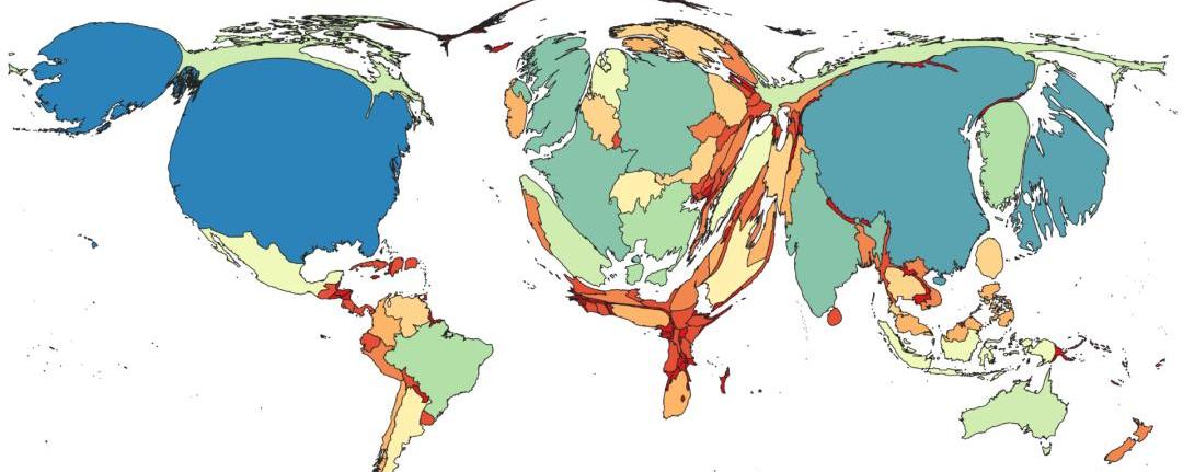 现在,我们按GDP?来对各国加权,这将让你大致了解全球收入分配情况。这意味着某些较发达的国家将膨胀,而较不发达国家将萎缩。但我会尽力保留这些国家的总体形状,以便使地图仍然清晰易懂。??