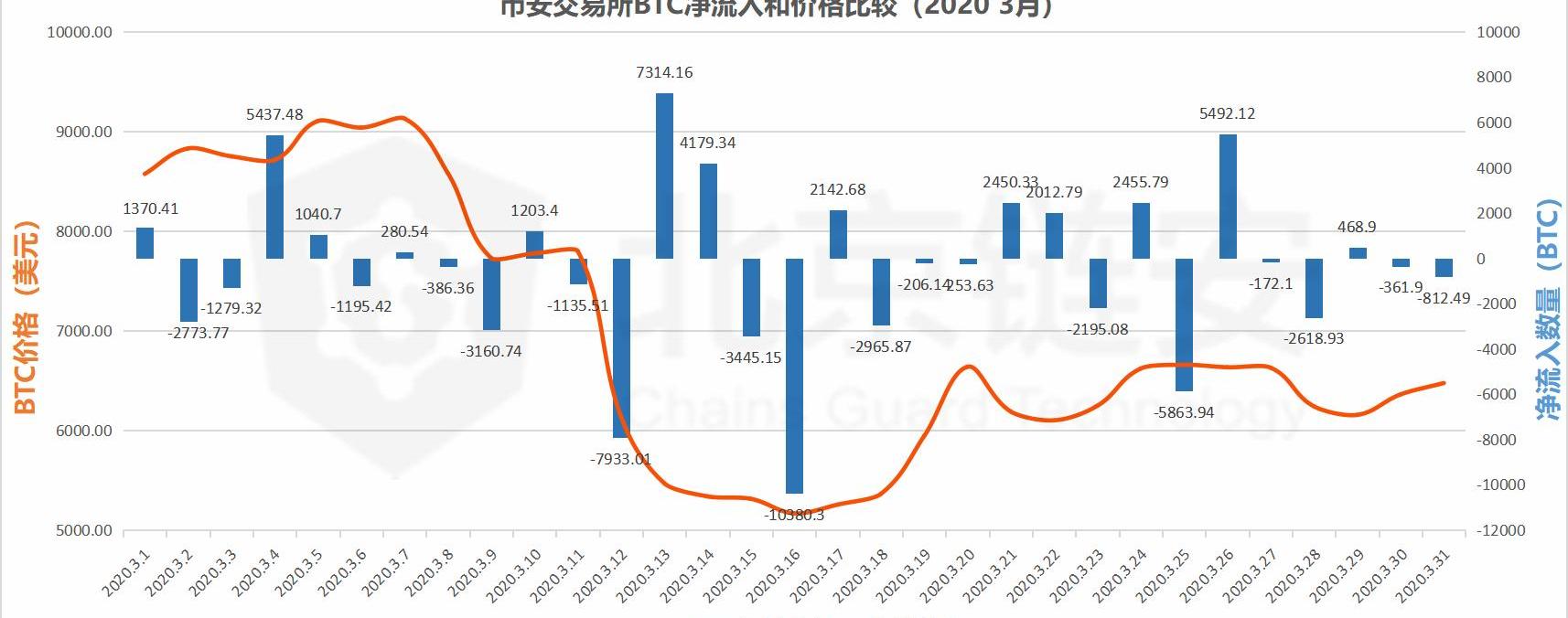 就3月数据来看,币安交易所流入403454.86BTC比2月上涨74.06%,流出414745.88BTC,比2月上涨89.97%,净流入-11291.02BTC比2月下降183.89%,显然,相关数据大幅提升的关键时间段还是3月12日大跌后到3月20日期间。