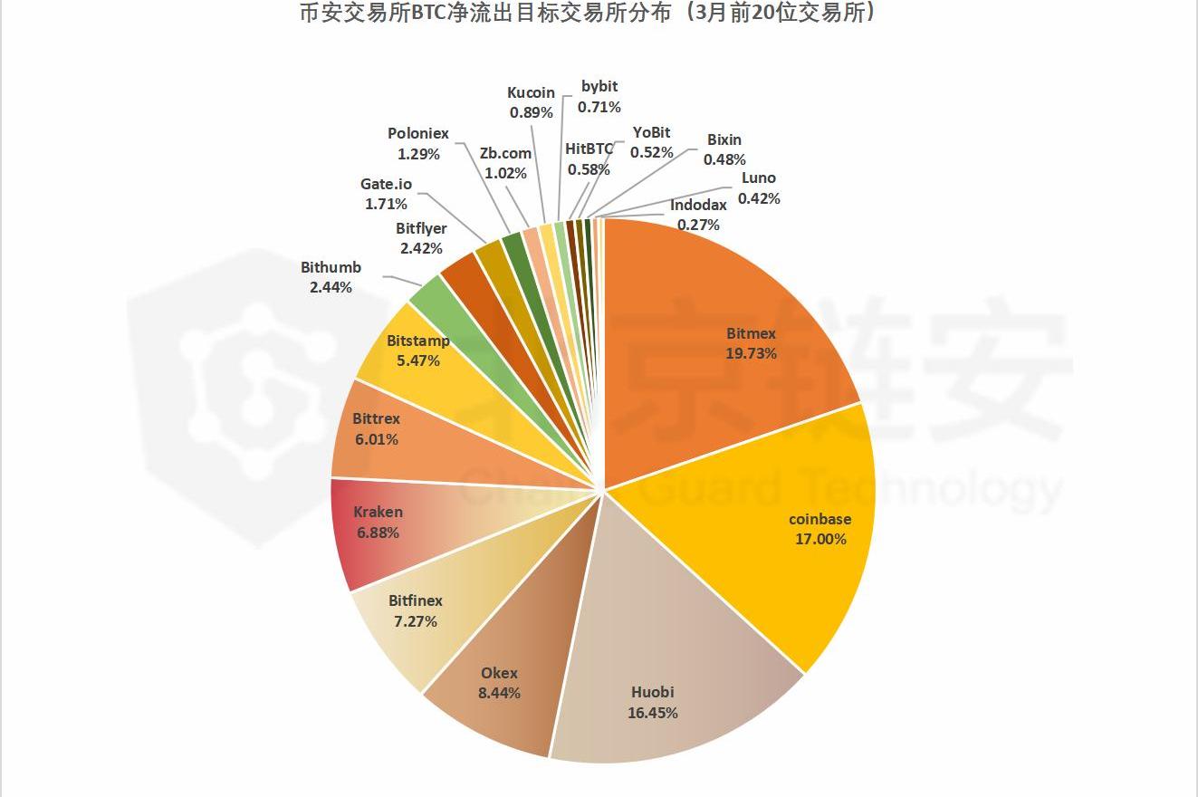 接下来,让我们看看,在3月份,币安、火币、Okex交易所提出的BTC,又主要流向了哪些交易所呢?经过我们的分析,列出了可以识别的前20位交易所的数据。