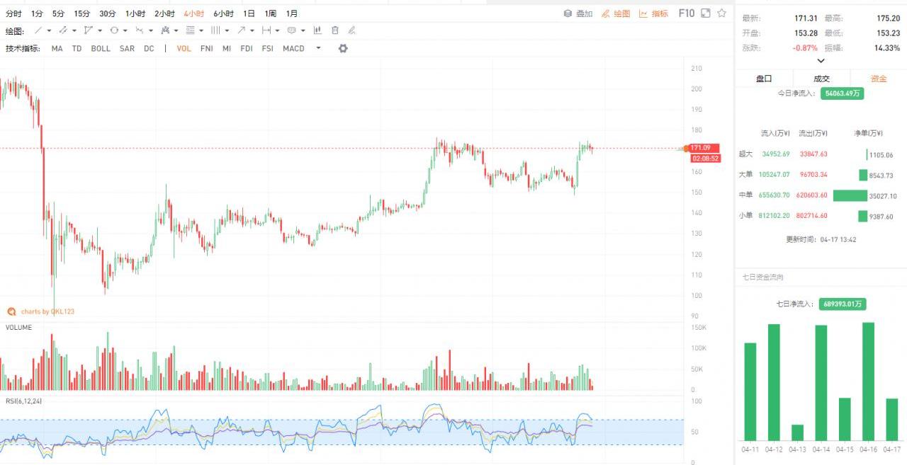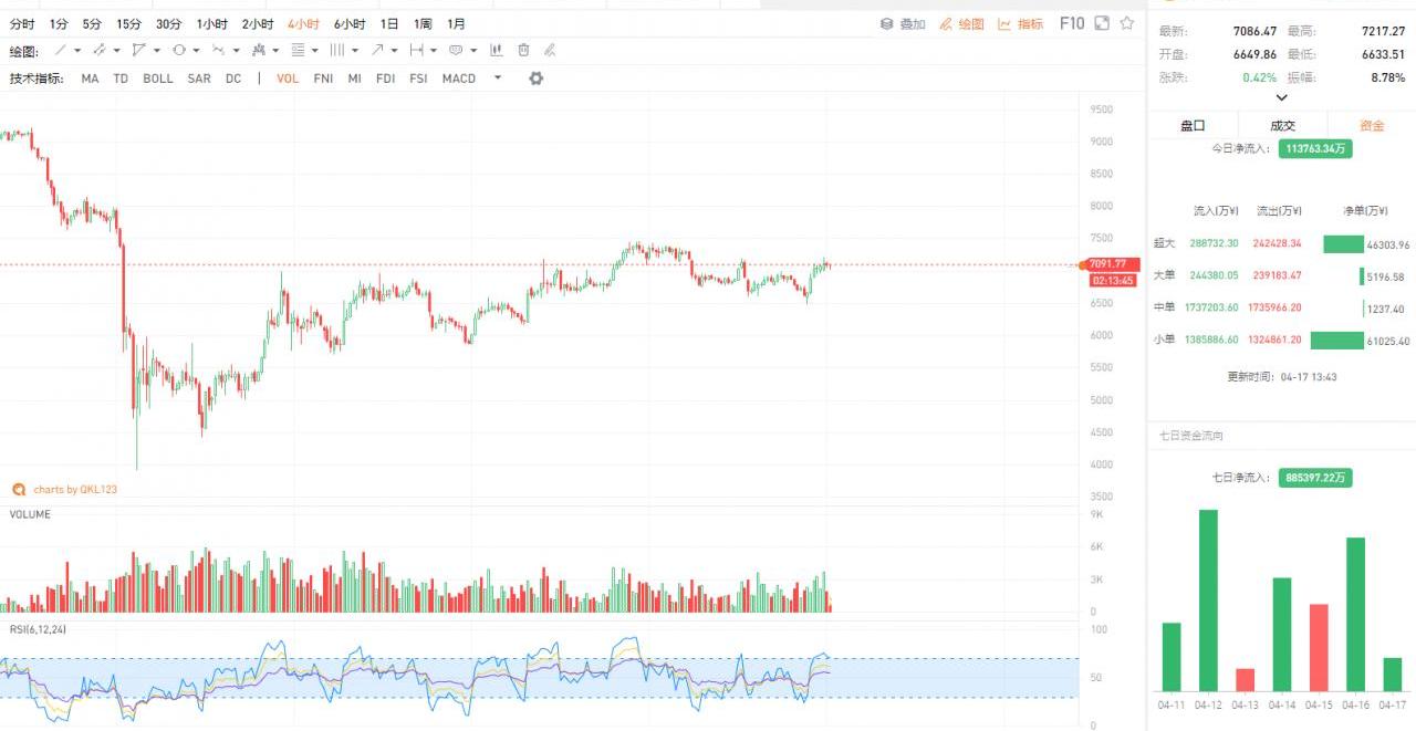 ETH止跌后率先启动上行,四小时K线低位锤子形后涨幅较大,直接站上前期高位。短时观察后续的量能支撑,大方向上还是看BTC的选择。