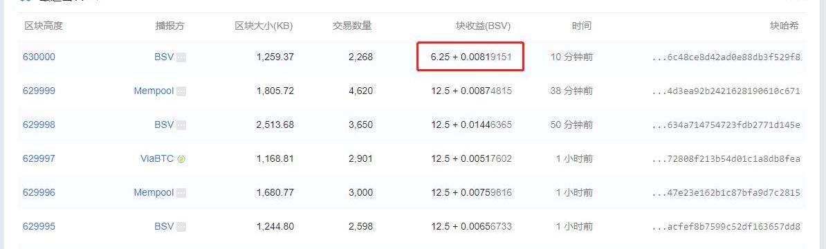 4月10上午8点48分,BSV网络迎来首次区块奖励减半,矿工爆块奖励由12.5BSV调整至6.25BSV。