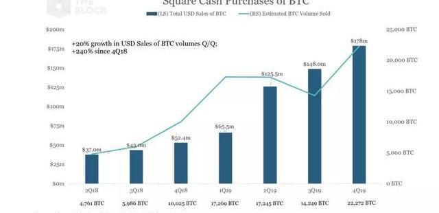 值得注意的是,CashApp内置了一个比特币交易功能。该功能允许用户在应用内买卖比特币。CashApp比特币交易服务去年第四季度为Square带来了1.78亿美元的收入。就2019年全年而言,这家支付公司登记的比特币交易额超过5.16亿美元,折合成毛利润为800万美元,比前两个季度增长了50%。