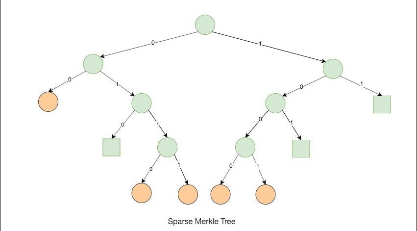 SparseMerkleTree使用256比特存储用户状态,理论上总共可以有2的256次方个账号。上图是4比特SparseMerkleTree的例子,每个橙色的叶子节点代表了一个用户;正方形的方块是占位符,表明该分支下没有账号,减少账号的存储;