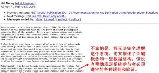 截图源自:2008年11月7日HalFinney在密码学邮件组对中本聪的回复