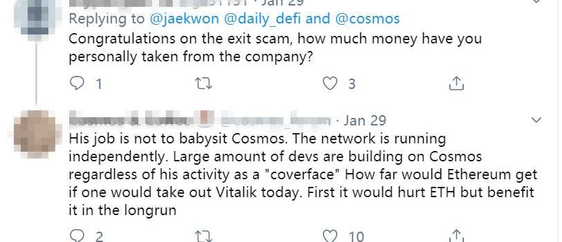 不看好的人说:「你从这个公司获利了多少?」也有人为其辩护:「他的工作不是照顾Cosmos,这个网络是独立的……如果Vitalik离开,肯定会伤害ETH,但长远来看,这反而是有益的。」