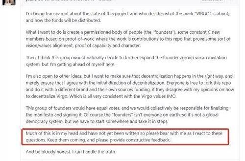 目前,JaeKwon是项目公开的负责人,去年10月,在GitHub一篇文章里,他极力说明,Virgo是一个完全透明,并且将会由JaeKwon价值观一致的人汇聚到一块的项目,很多设想还未成型,「还没写下来」,「请大家耐心等待。」