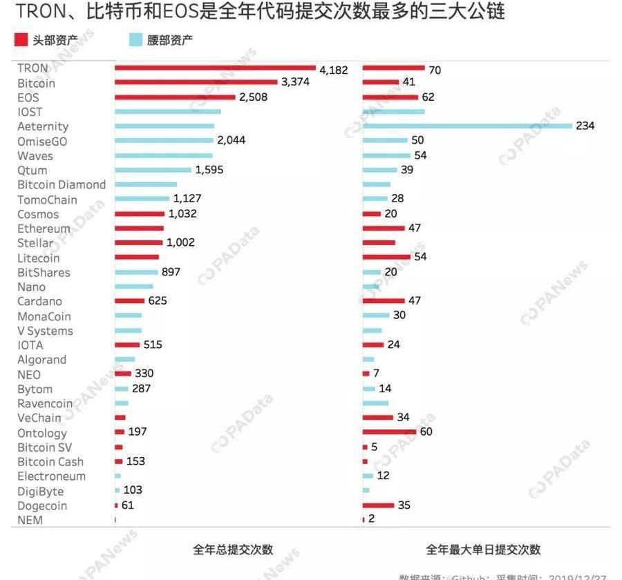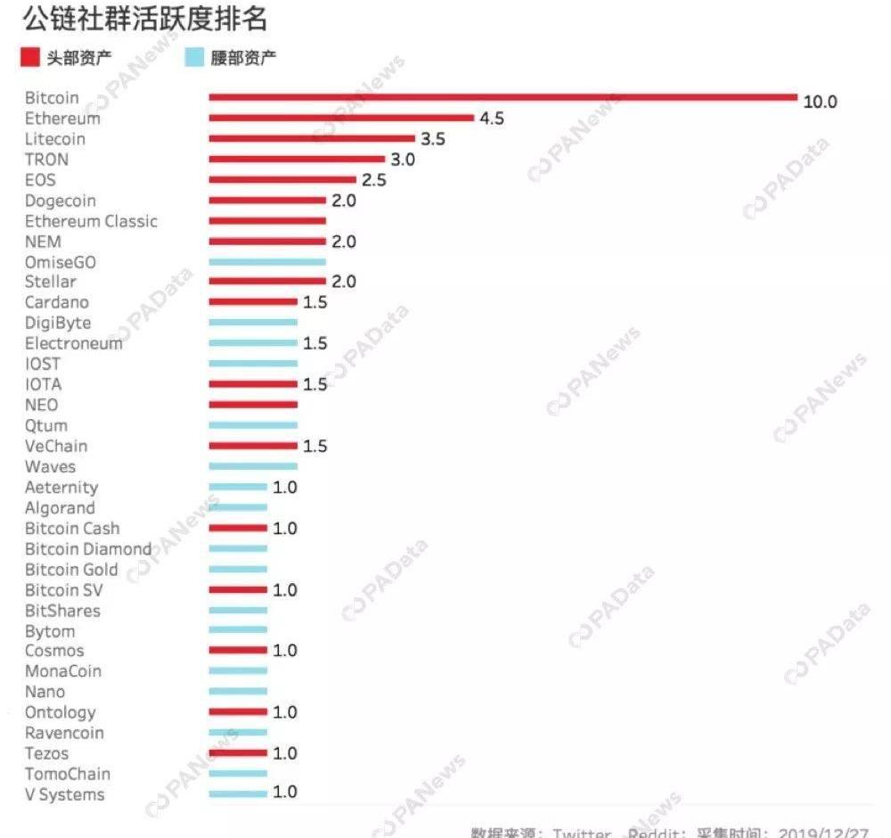 PAData选取了CoinMarketCap上市值排名前100中的35个公链项目,市值前20的公链项目为头部资产项目,市值排名21-100的公链项目为腰部资产项目,通过对这些项目Github数据、链上数据、社交媒体数据进行梳理和分析,盘点2019“公链之最”。